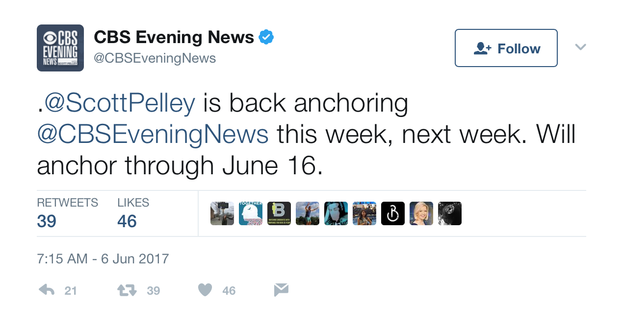 “CBS Evening News” anchor Scott Pelley now knows how much more time he has on the network’s flagship news program. Pelley is back from a time out to report for “60 Minutes,” and the program announced on Twitter that he will stay in the anchor chair through Friday, June 16.