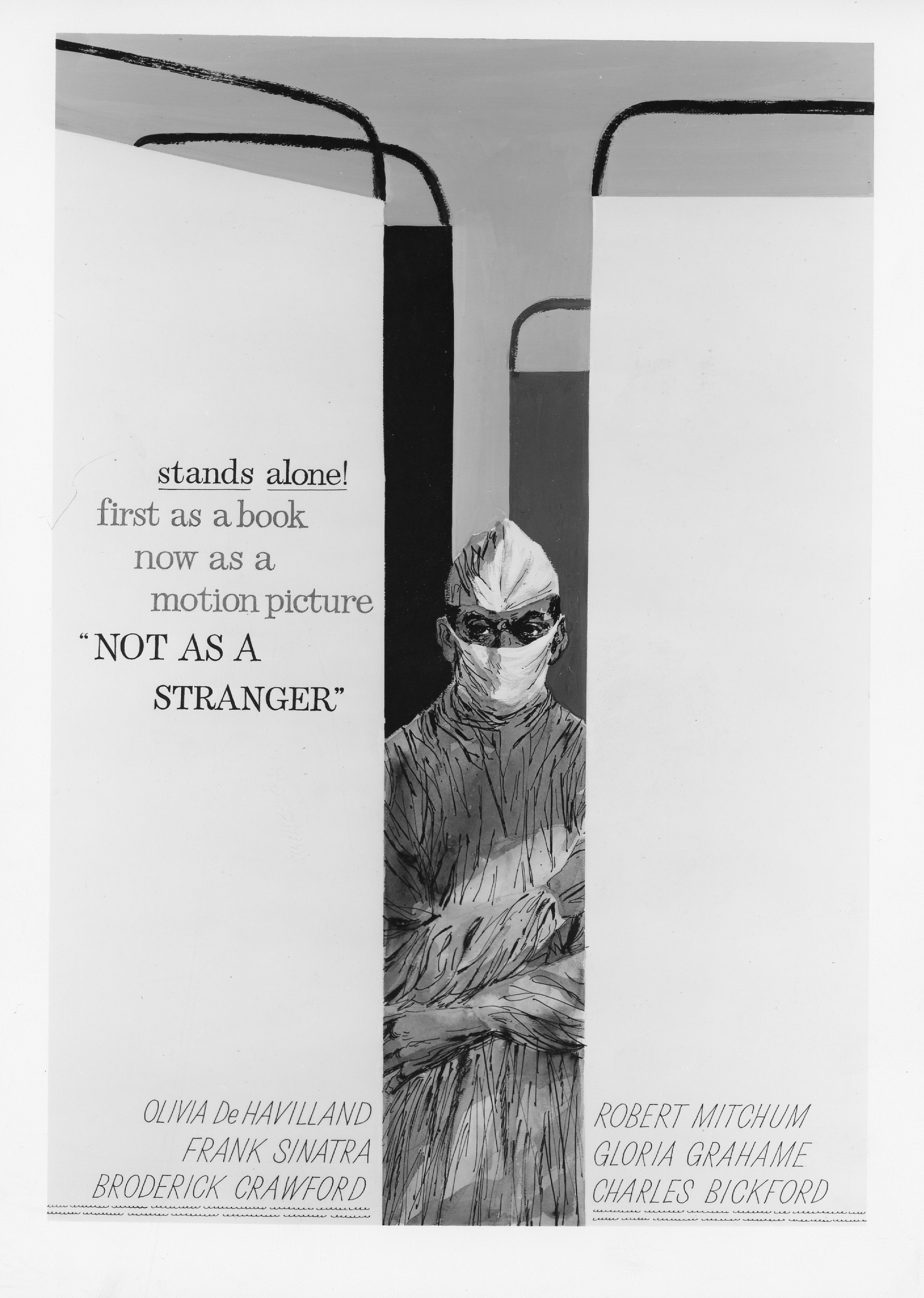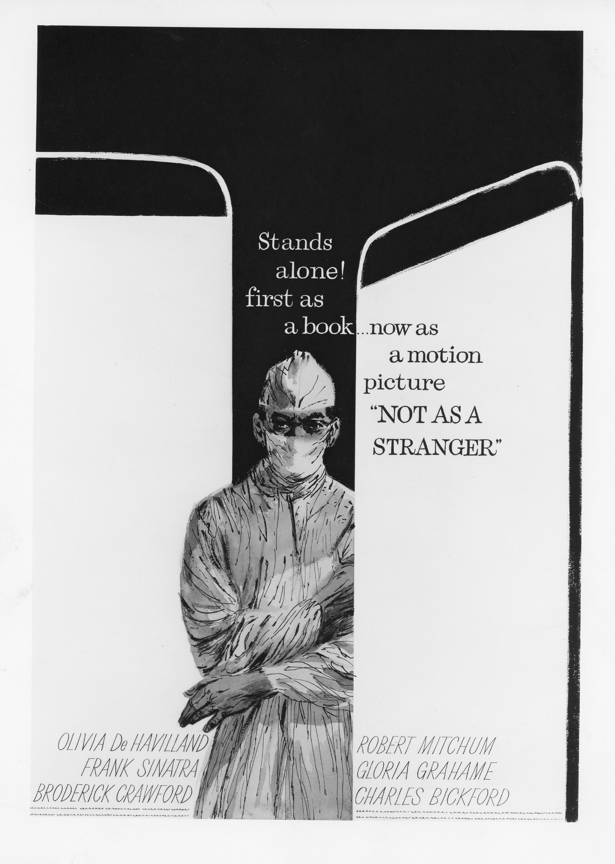 Here are the six Bass/Kallis illustrations done for Stanley Kramer’s “Not as a Stranger.” Though Bass had a long and fruitful relationship with Kramer, I could only find evidence that two of these drawings were actually used to advertise the film in any way. However, the primary figure in all of these drawings — that of the doctor in full operating regalia, including his mask — was the primary notion in all of the posters for the movie, and in the two consumer advertisements used most.