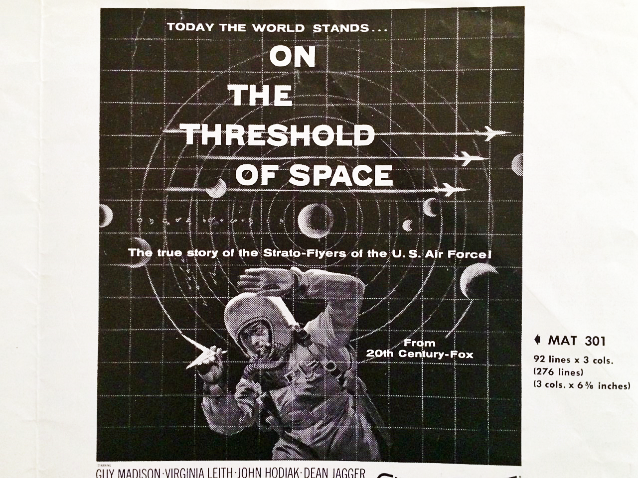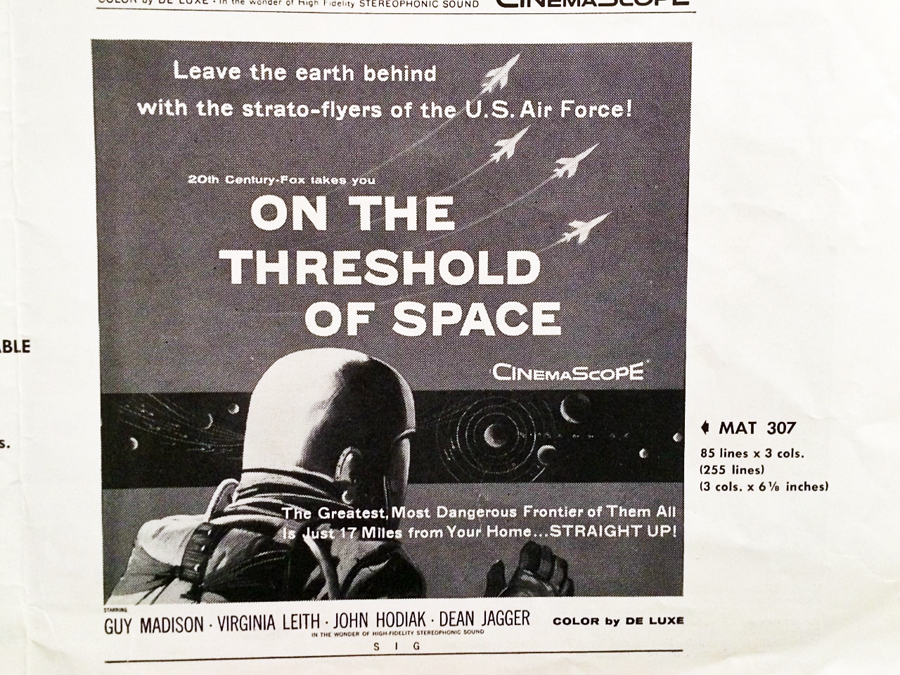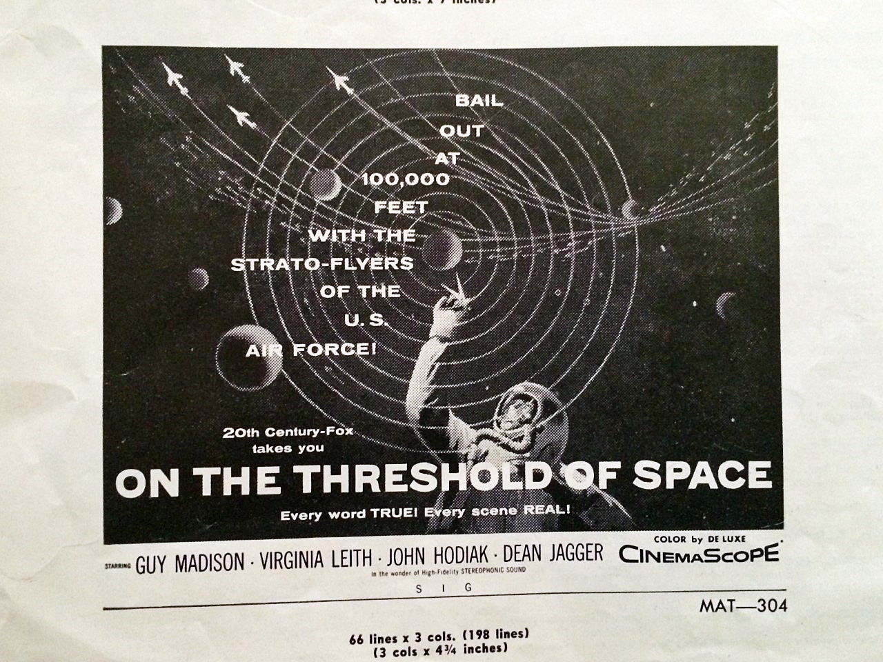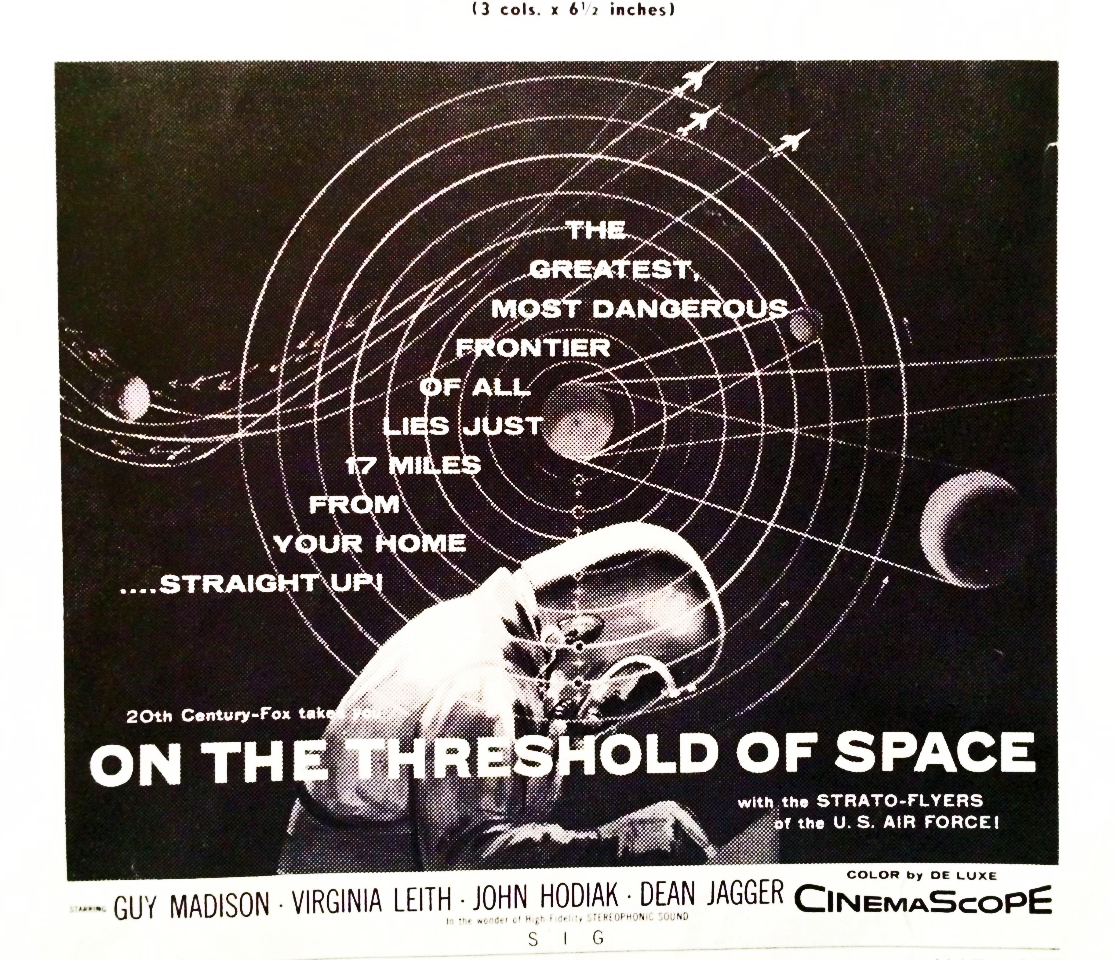 Here are the actual ads for “On the Threshold of Space” as they ran in the pressbook for the movie. Unfortunately, in each of the ads jet planes were added, as you will see.