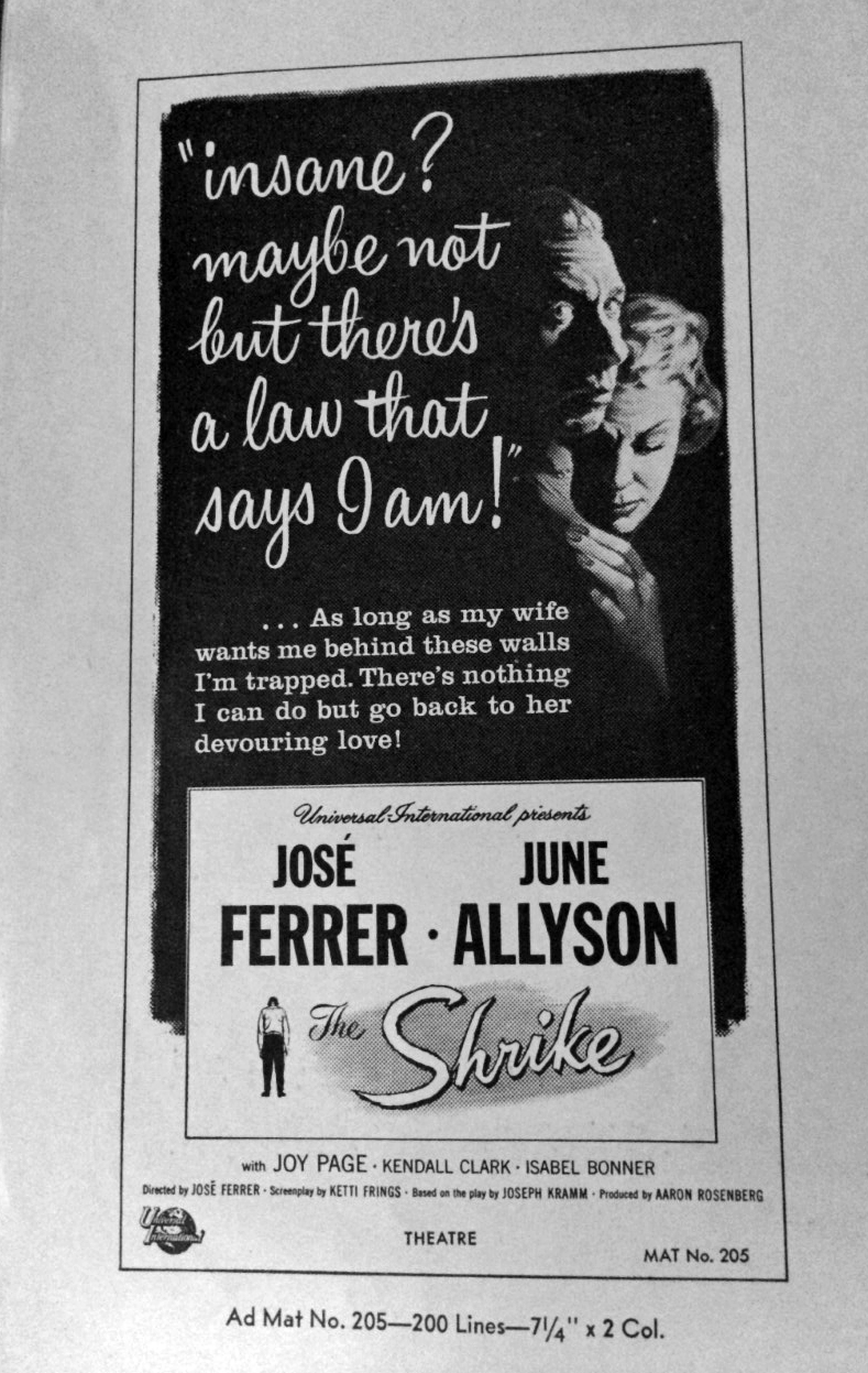 What I did find was the same illustration on two pieces of material in the pressbook for “The Shrike.” One was the six-sheet poster for the film, the other was for a consumer ad, ad mat 205. Here they both are: