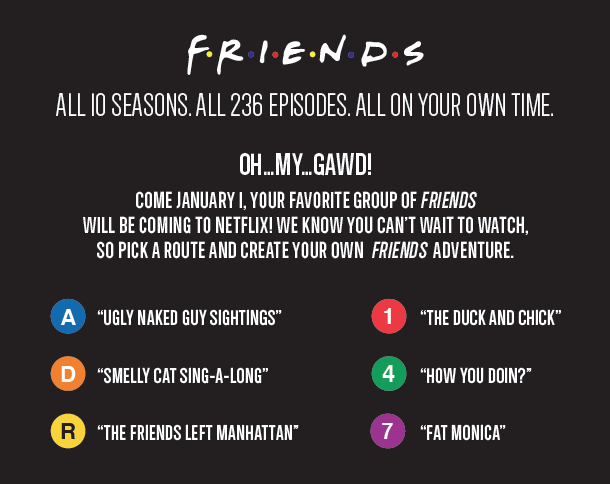 “To celebrate the show’s debut, Netflix has ‘mapped out’ some fun ways for viewers to enjoy the series,” the streaming service said in its announcement. “Do you just want to see episodes where Joey says, ‘How You Doin?’ You can do that. Only interested in watching episodes where Phoebe sings ‘Smelly Cat?’ You can do that too!”