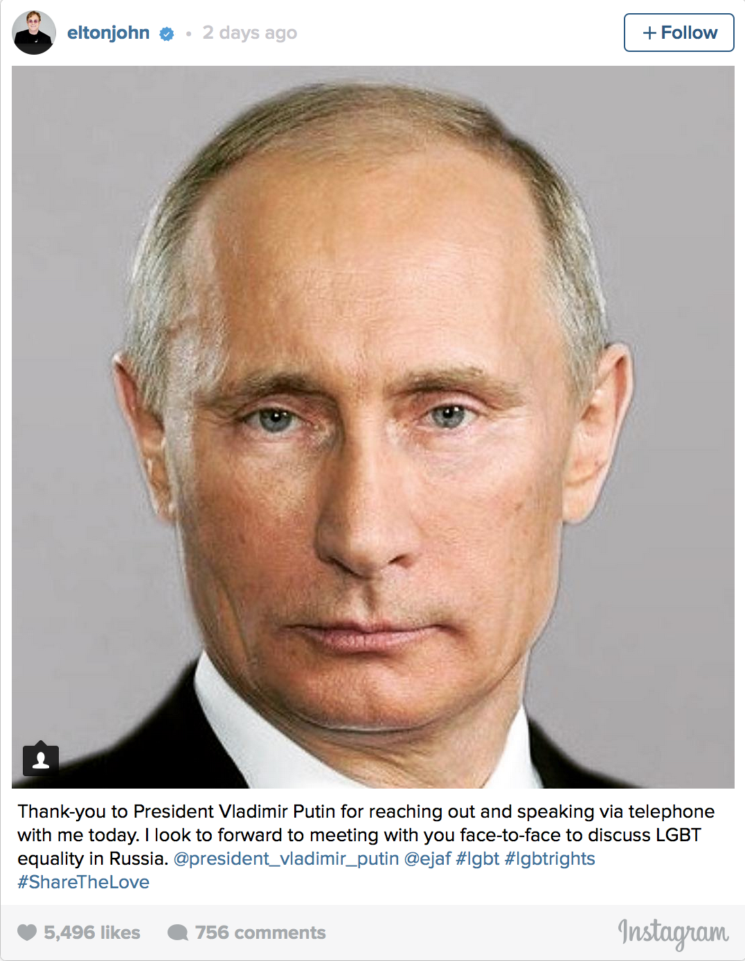 Elton John and the Kremlin have been giving conflicting accounts of an incident in which the singer says Russian President Vladimir Putin called him to discuss the country’s policy on gay rights. The Kremlin denied that Putin ever placed the call, triggering what the U.K. publication The Telegraph calls “a bizarre war of words.”