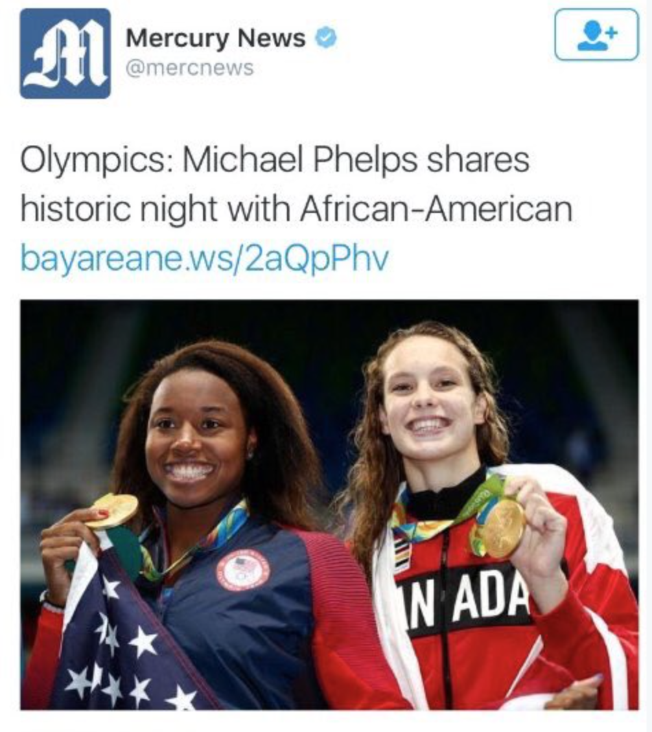 Following Gold Medal performances by U.S. swimmers Michael Phelps and Simone Manuel, The San Jose Mercury-News ran the headline “Michael Phelps shares historic night with African-American” on its website. The paper also used the headline on a subsequent tweet, which you can see below.