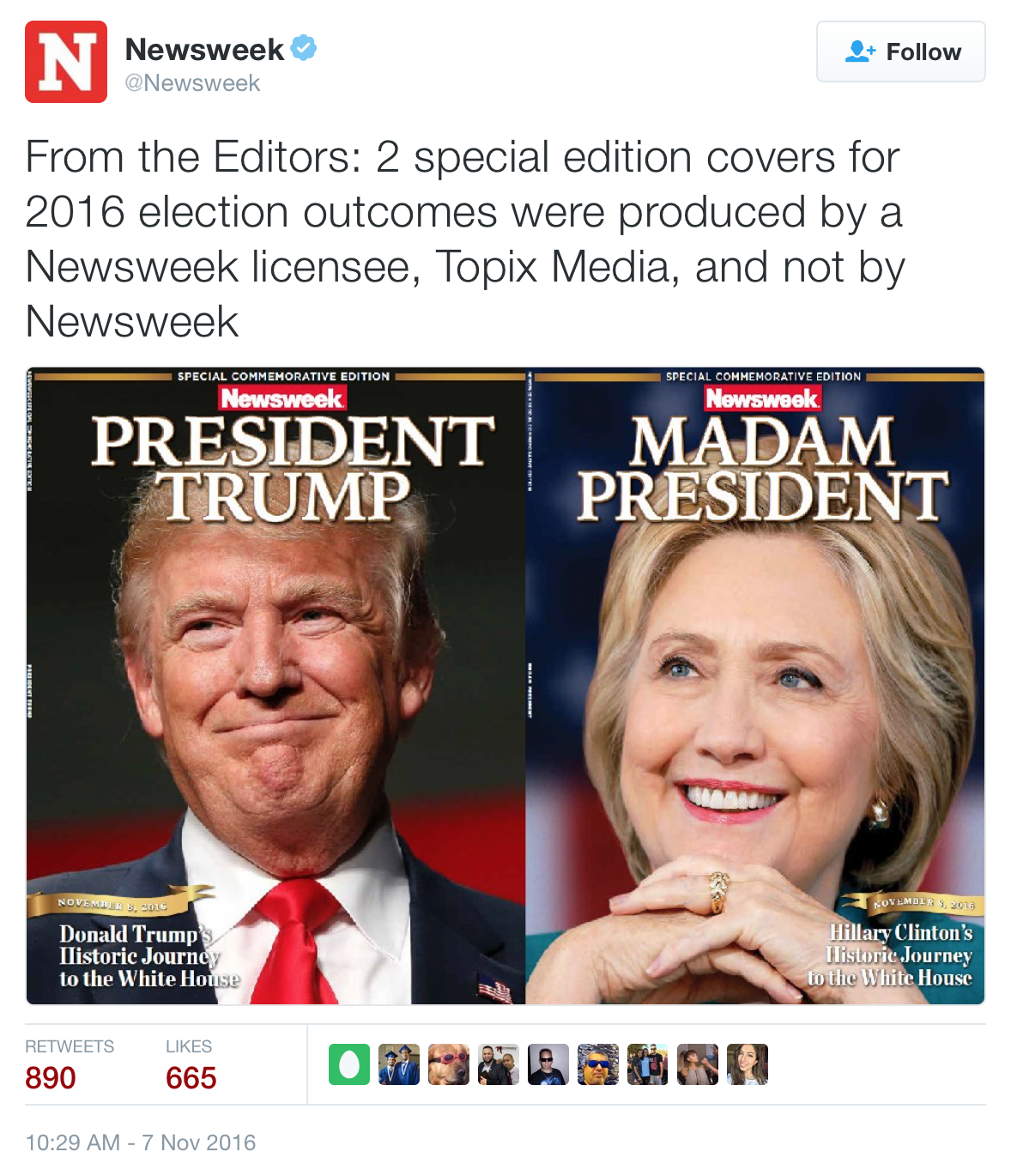 Here’s Newsweek’s tweet, showing the two covers along with a “buck doesn’t stop here”-type disclaimer …