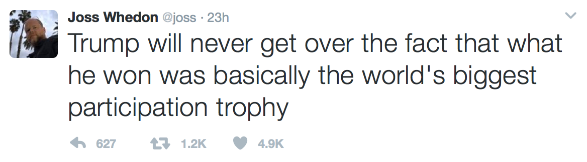 The criticism does not appear to have moved Whedon off his message, with his Twitter critique of Trump still going strong. On Wednesday he tweeted: “We have a dictator. Wow. We’re THAT country now.”