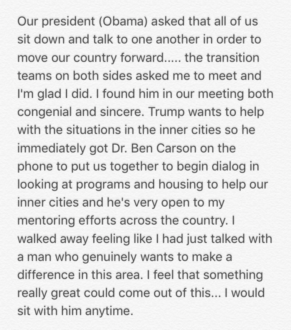 Harvey indicated that he was inspired by President Obama to reach out in an effort to help the country move forward. He said he found Trump “both congenial and sincere.”