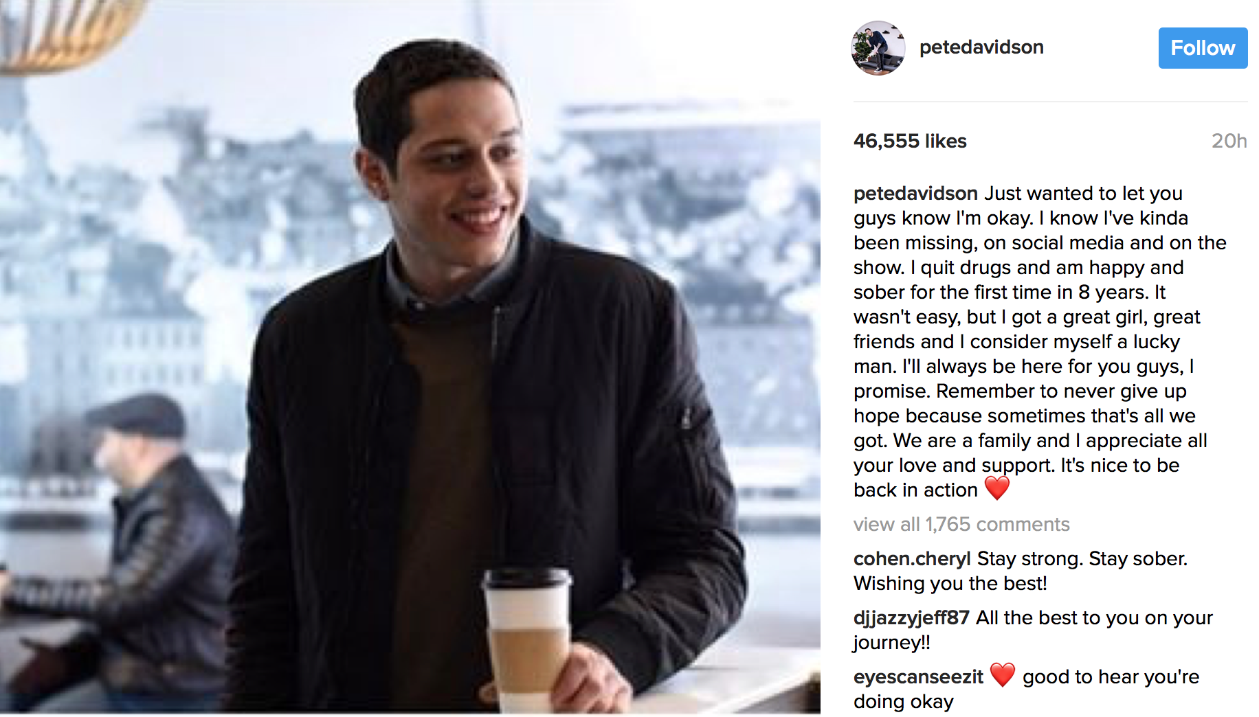 “Just wanted to let you guys know I’m okay,” Davidson wrote in his Instagram post, which you can see below. “I know I’ve kinda been missing, on social media and on the show. I quit drugs and am happy and sober for the first time in 8 years.”