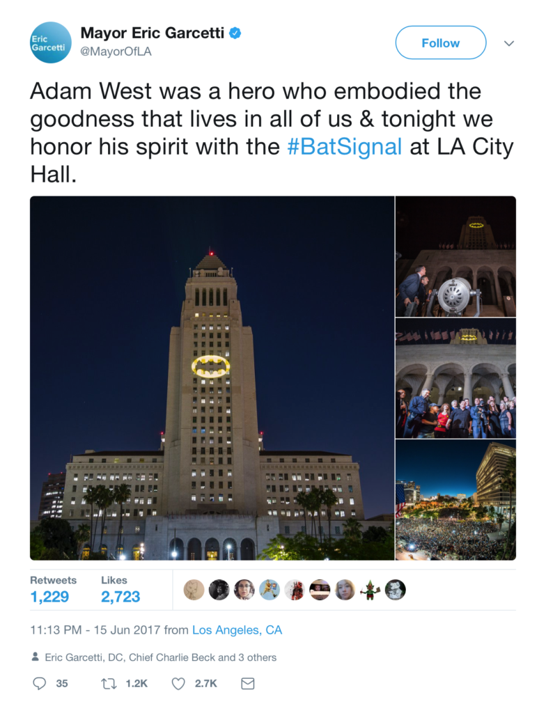 The City of Los Angeles paid tribute Thursday to actor Adam West, who played Batman in ABC’s “Batman” TV series of the 1960s. L.A. Mayor Eric Garcetti lit a Bat-signal and shined it on L.A. City Hall, emulating the use of the Bat-signal by the City of Gotham whenever it needed to summon Batman.