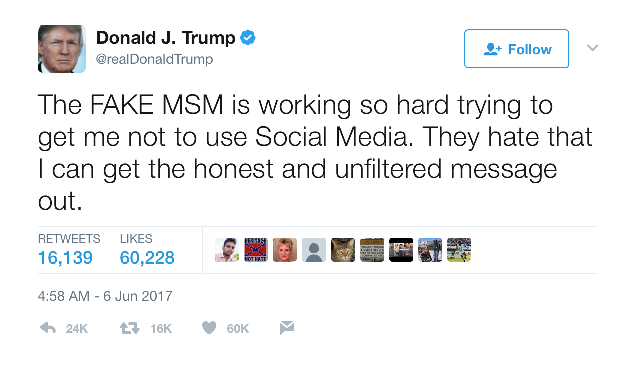 In one tweet this morning, he wrote: “The FAKE MSM is working so hard trying to get me not to use Social Media. They hate that I can get the honest and unfiltered message out.”