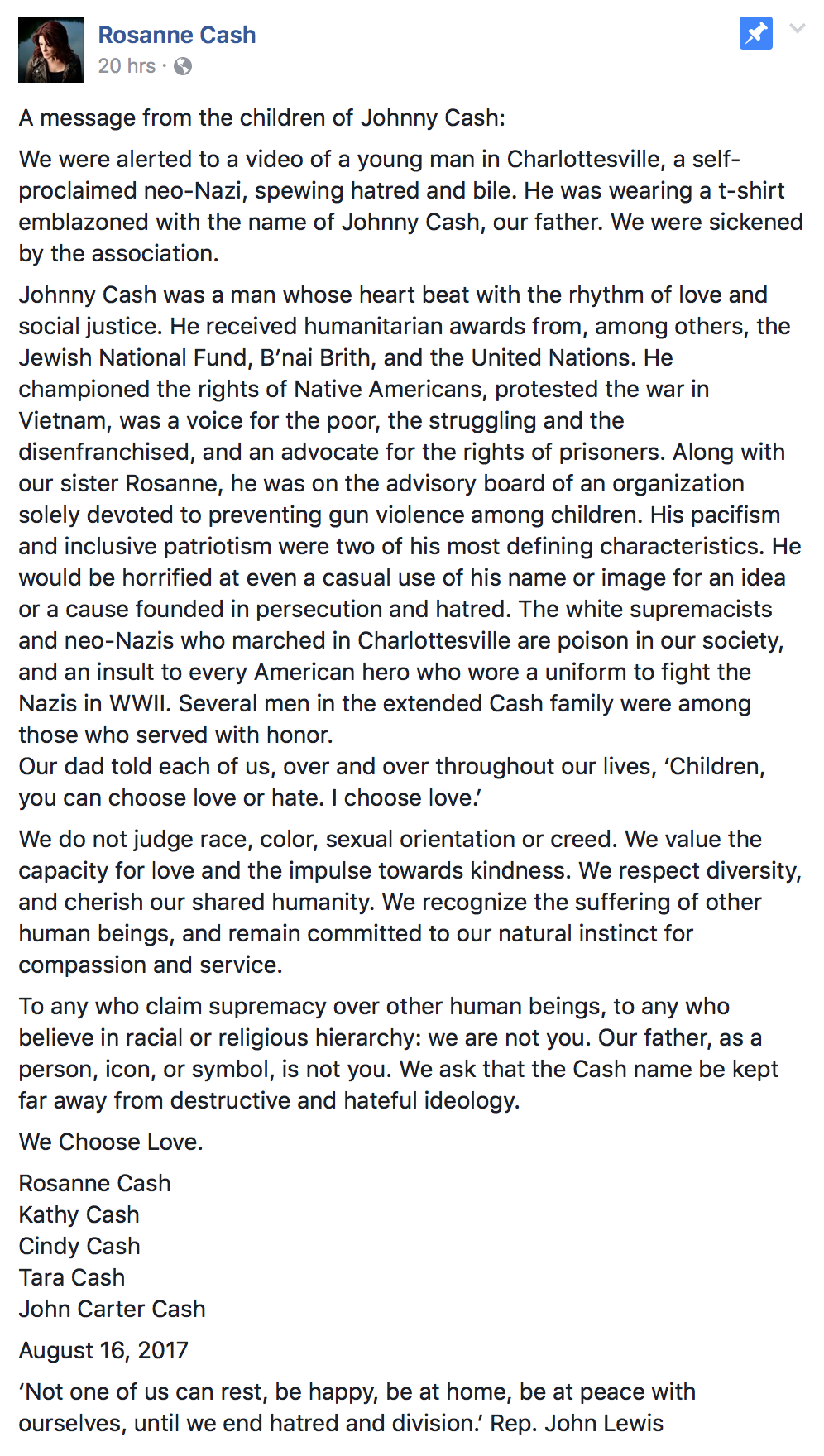The Facebook message also says of Johnny Cash: “His pacifism and inclusive patriotism were two of his most defining characteristics. He would be horrified at even a casual use of his name or image for an idea or a cause founded in persecution and hatred. The white supremacists and neo-Nazis who marched in Charlottesville are poison in our society, and an insult to every American hero who wore a uniform to fight the Nazis in WWII.”