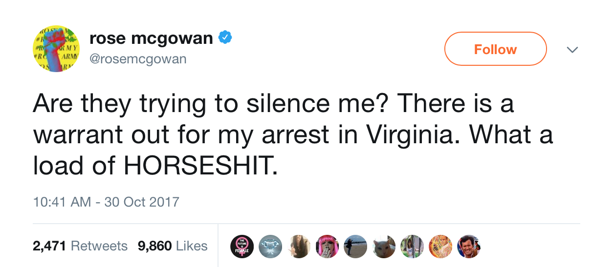 McGowan issued a tweet saying: “Are they trying to silence me? There is a warrant out for my arrest in Virginia. What a load of HORSESHIT.”