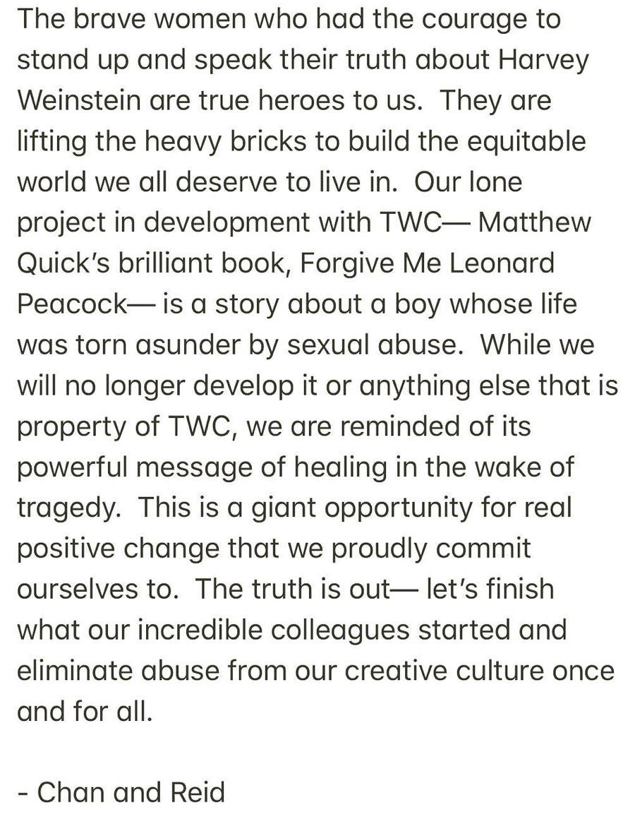 Tatum addressed the Harvey Weinstein scandal in his post, writing: “The truth is out — let’s finish what our incredible colleagues started and eliminate abuse from our creative culture once and for all.”