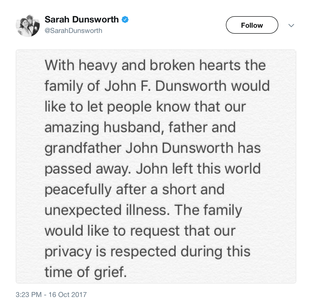 Dunsworth’s daughter Sarah announced his death in a Twitter post, which you can read below.