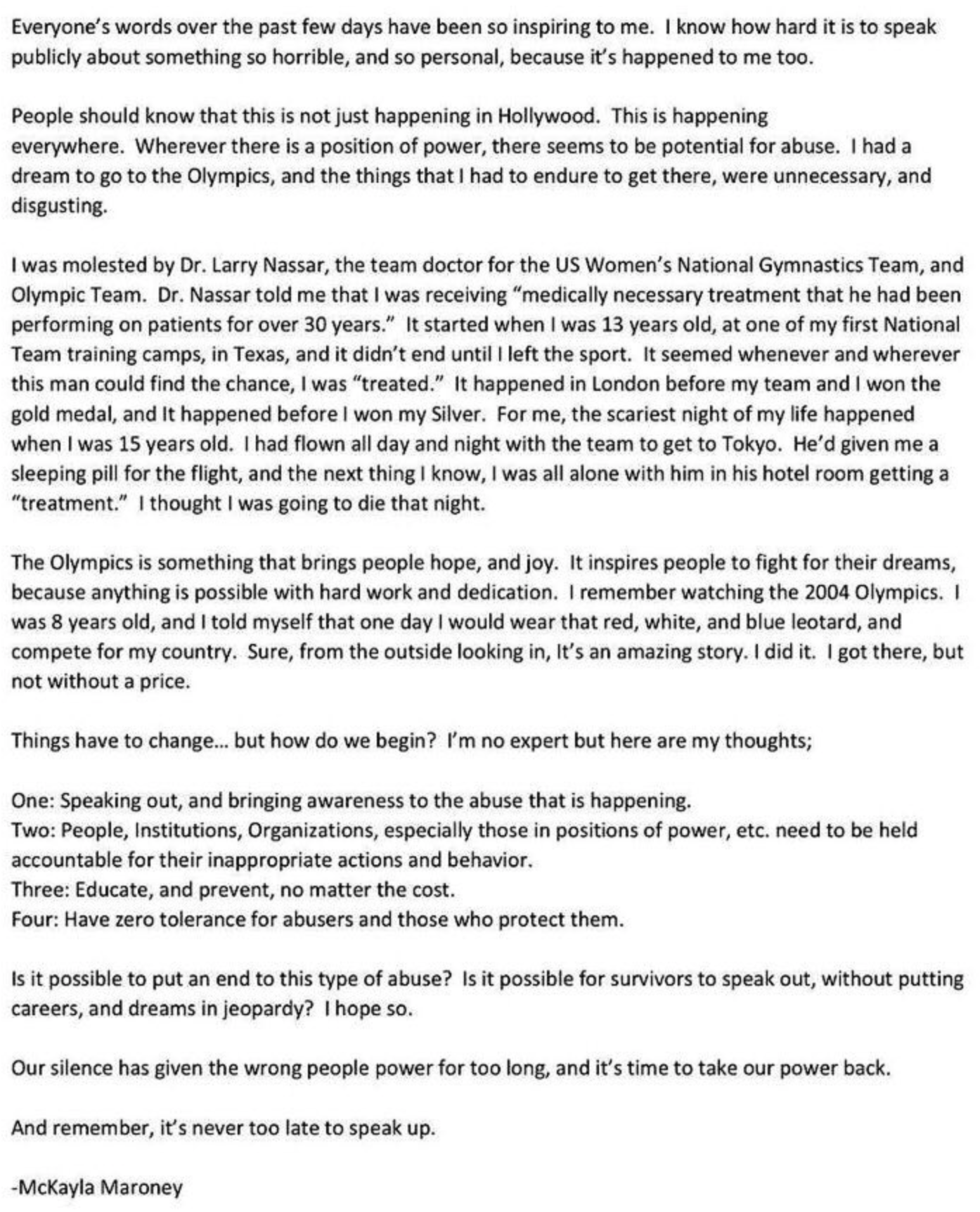 USA Gymnastics issued a statement in response to Maroney’s post, saying: “USA Gymnastics admires the courage of those, like McKayla Maroney, who have come forward to share their personal experiences with sexual abuse. Because of their strength in coming forward, predators can be held accountable for their actions. We, like so many others, are outraged and disgusted by the conduct of which Larry Nasser is accused. We are sorry that any athlete has been harmed during her or his gymnastics career.”