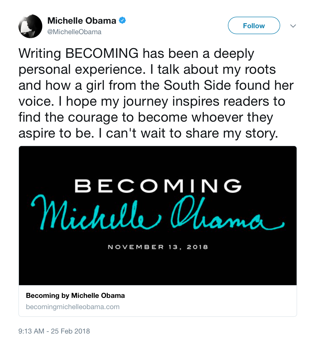 Here’s a tweet sent out Sunday by Michelle Obama announcing plans for her book …