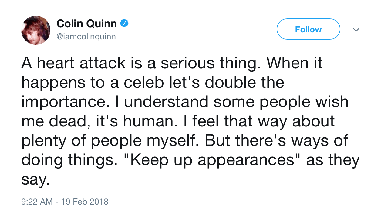 “The 58-year-old Quinn took to Twitter on Monday to let friends and foes alike know he’s ‘starting a list of those who didn’t “check in” yet,’ five days after his Valentine’s Day health emergency,” the AP reports. “The deep-thinking comic thanks the doctors and nurses at his New York hospital, saying they ‘realized they had a precious jewel of comedy in their hands.’”