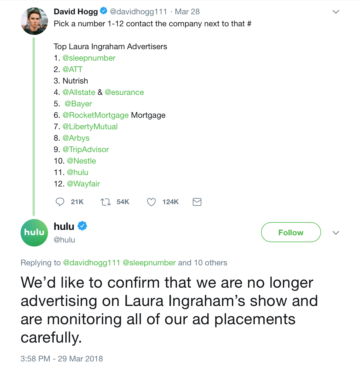 Hogg responded with a tweet of his own, calling on supporters to put pressure on Ingraham’s advertisers. Here’s Hogg’s tweet along with a response from Hulu …