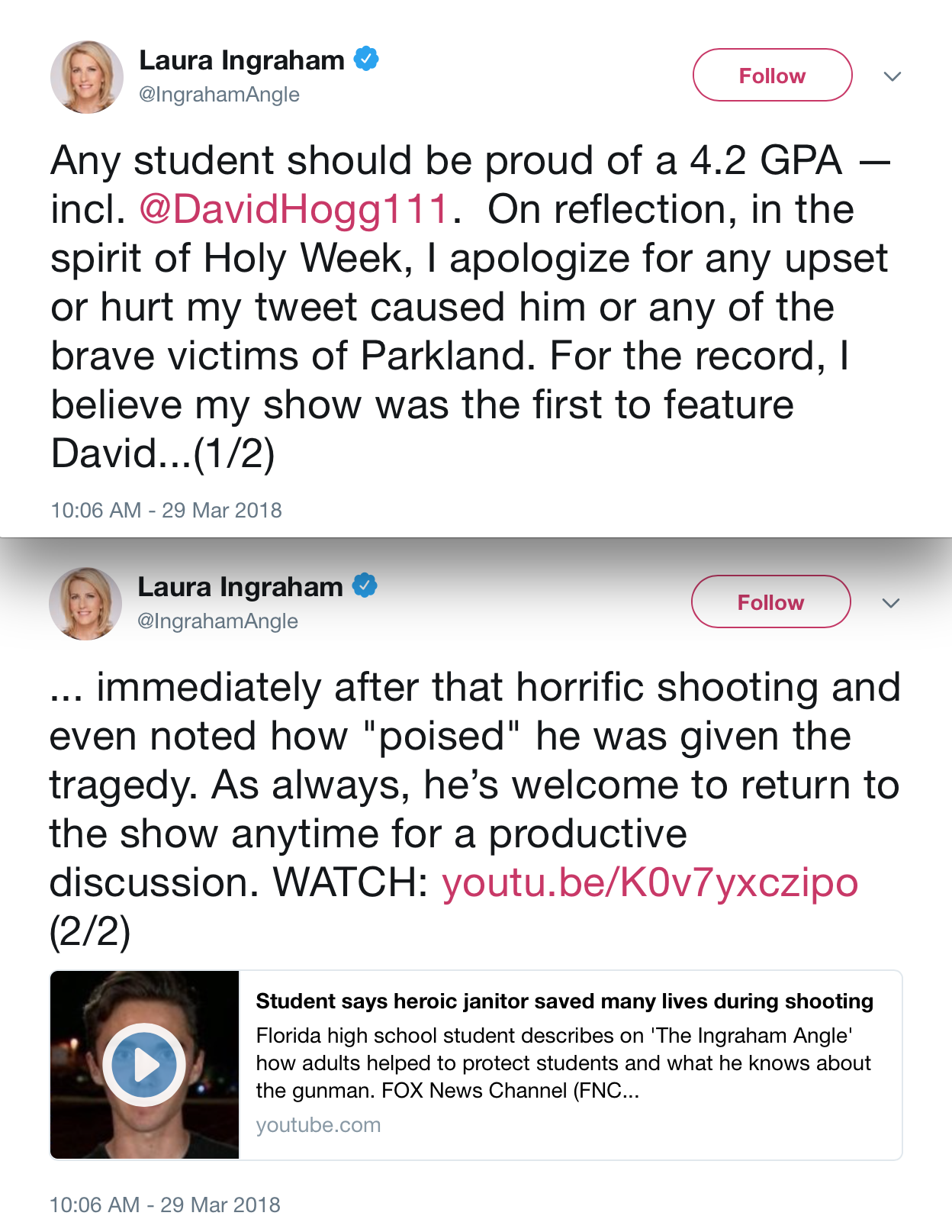 Ingraham returned to Twitter on Thursday to issue an apology to Hogg, which you can see below …
