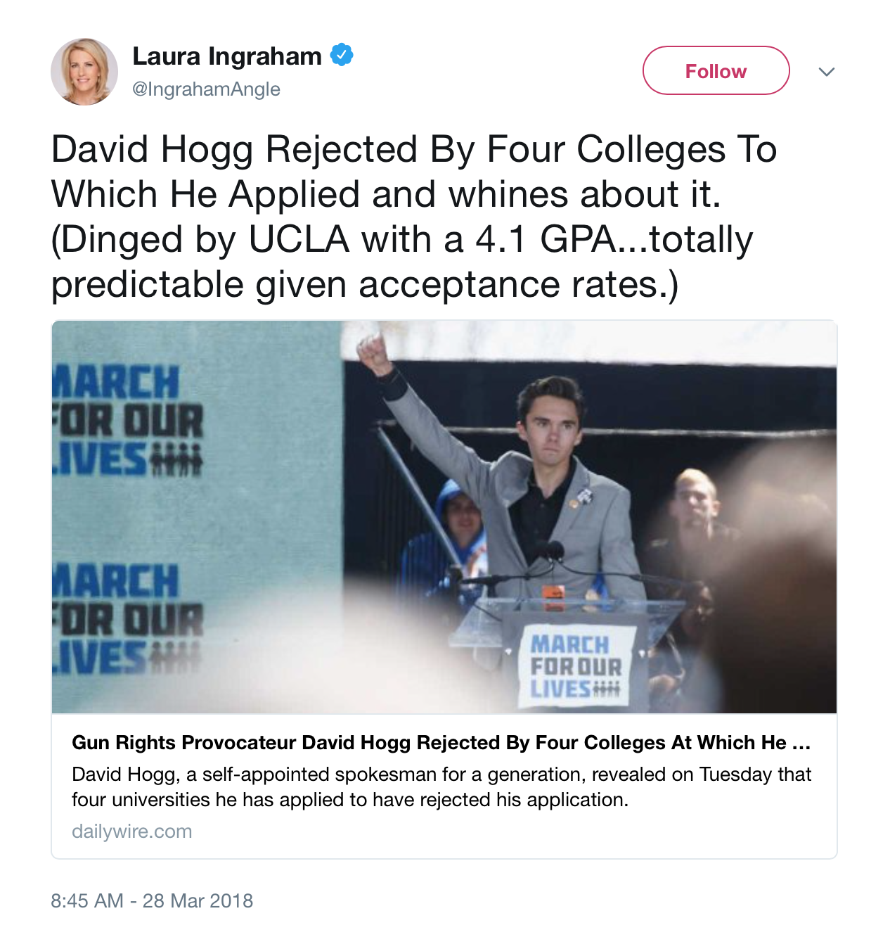 “Ingraham on Wednesday posted a mocking tweet of high school senior David Hogg, taunting him for not getting into some colleges he had applied to,” CBS News reports. “In response, Hogg tweeted a list of advertisers on Ingraham’s show and called on followers to contact them.”