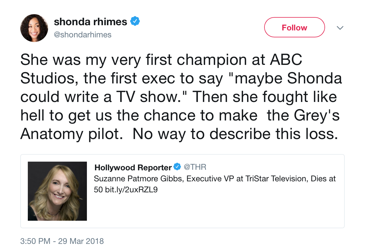 “In the early 2000s, that list included then-TV newcomer Shonda Rhimes,” Variety adds. “Rhimes credited Patmore Gibbs as ‘the first exec to say “Maybe Shonda could write a TV show”‘ in a tweet paying tribute to the executive.”