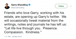 The tweet, which you can see below, says “friends who love Garry” are working with his estate to put out material from the writings, notes and journals Shandling left behind.