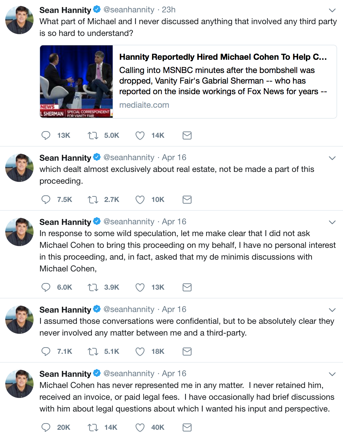 Hannity started the posts by writing: “Michael Cohen has never represented me in any matter. I never retained him, received an invoice, or paid legal fees. I have occasionally had brief discussions with him about legal questions about which I wanted his input and perspective.”