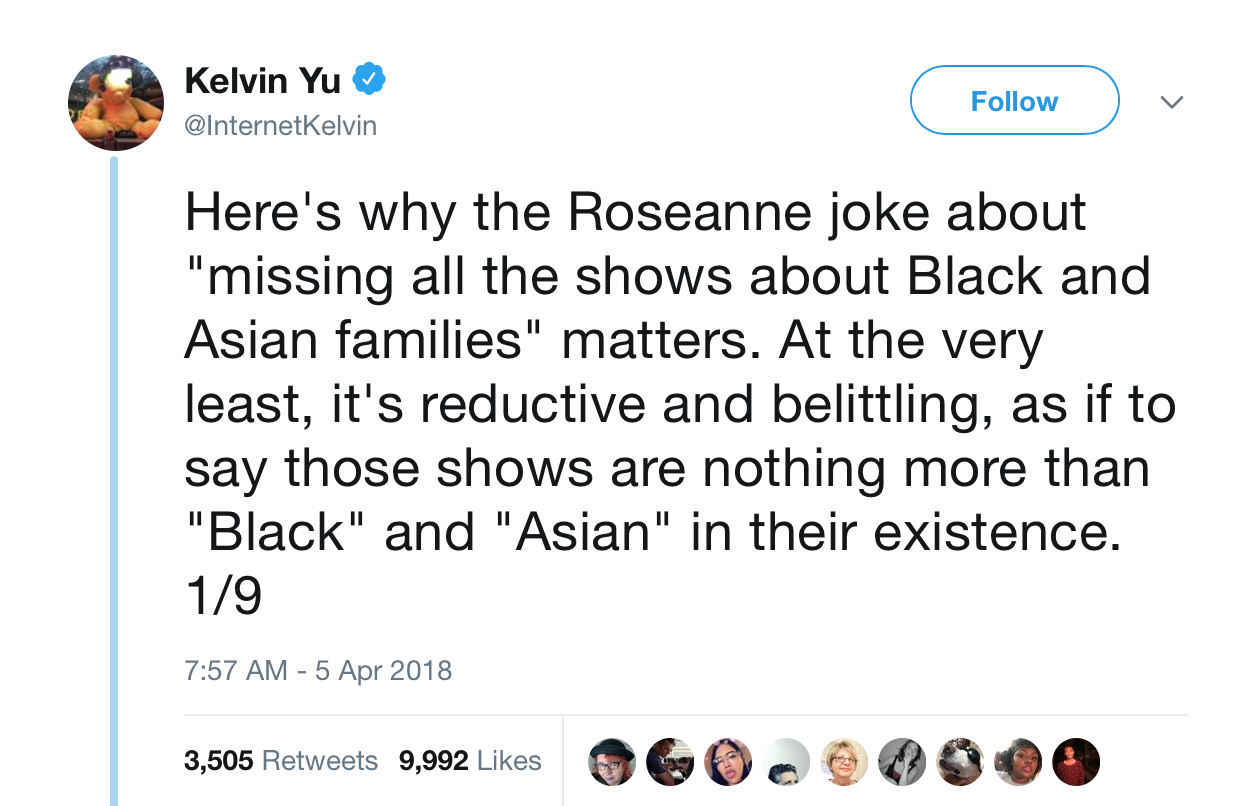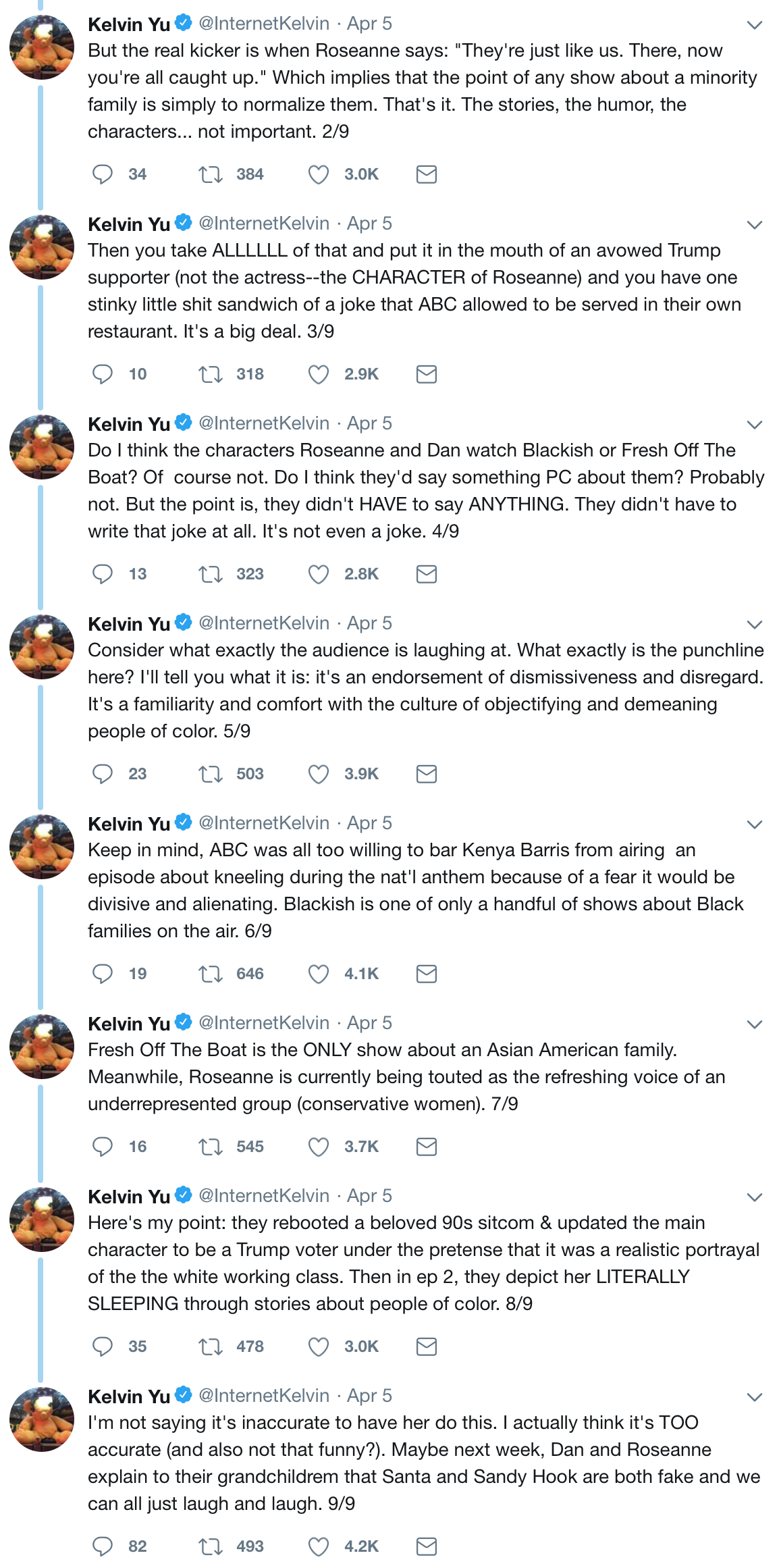 Another critic of the “Roseanne’ segment surfaced on Twitter, where “Bob’s Burgers” writer Kelvin Yu released a nine-part response to the joke. You can see it below …