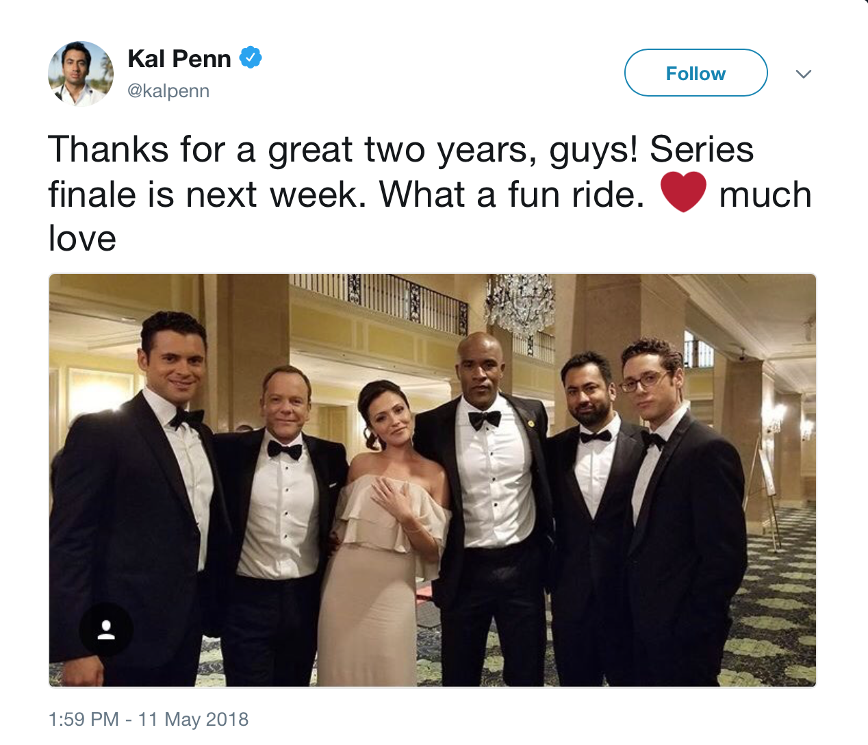 Below is a tweet from “Designated Survivor’s” Kal Penn confirming the show’s cancellation …