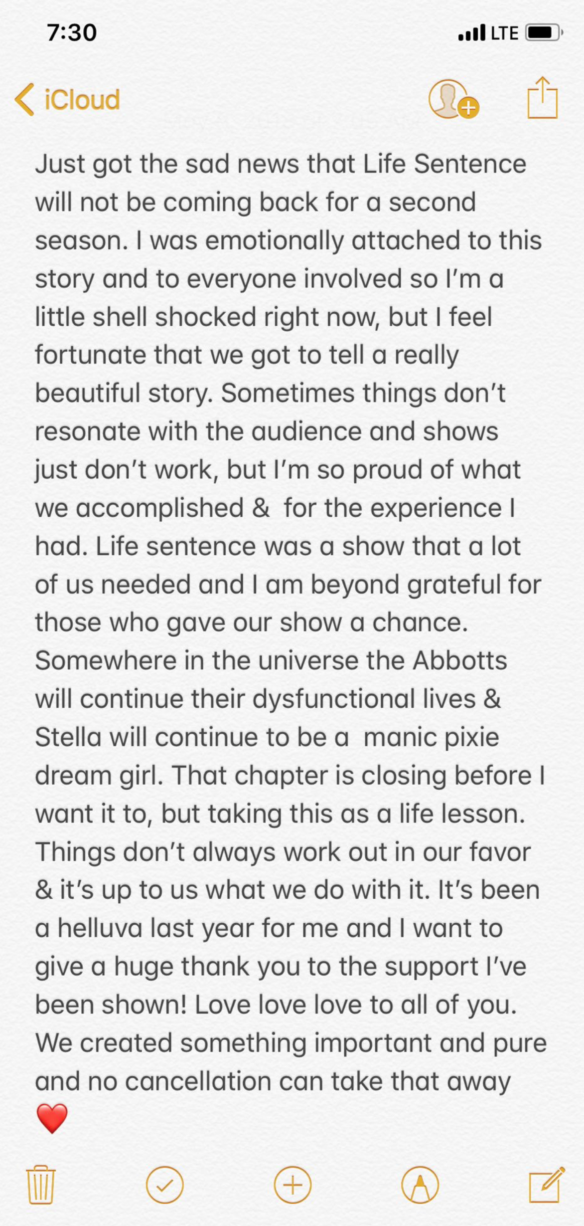 Also a casualty was “Life Sentence’s” fellow CW freshman show, “Valor.” Kyle Jarrow, the show’s creator and executive producer, tweeted the news, writing: “The sad news is out: #Valor won’t have a new season. So grateful to the cast, crew, writers & FANS. Thanks for going on this ride with us.”