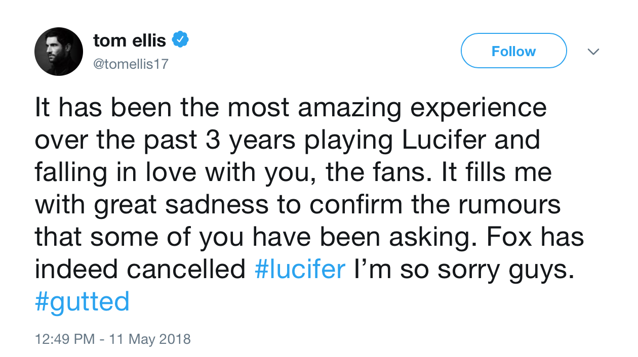 The cancellation ax has fallen on a Fox drama series. Announcing the demise of the show on which he plays the title role, “Lucifer” star Tom Ellis broke the news on Twitter.