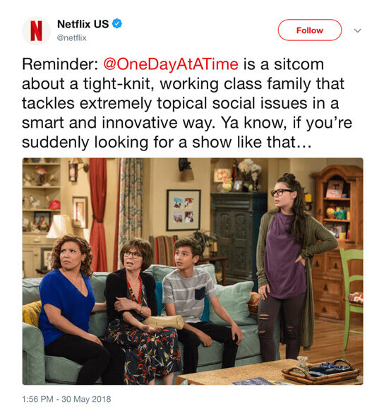 The streamer sent out a Twitter message promoting its own comedy reboot, “One Day at a Time,” highlighting a few things about the show that make it sound remarkably similar to “Roseanne.” Netflix added the kicker at the end: “Ya know, if you’re suddenly looking for a show like that …”