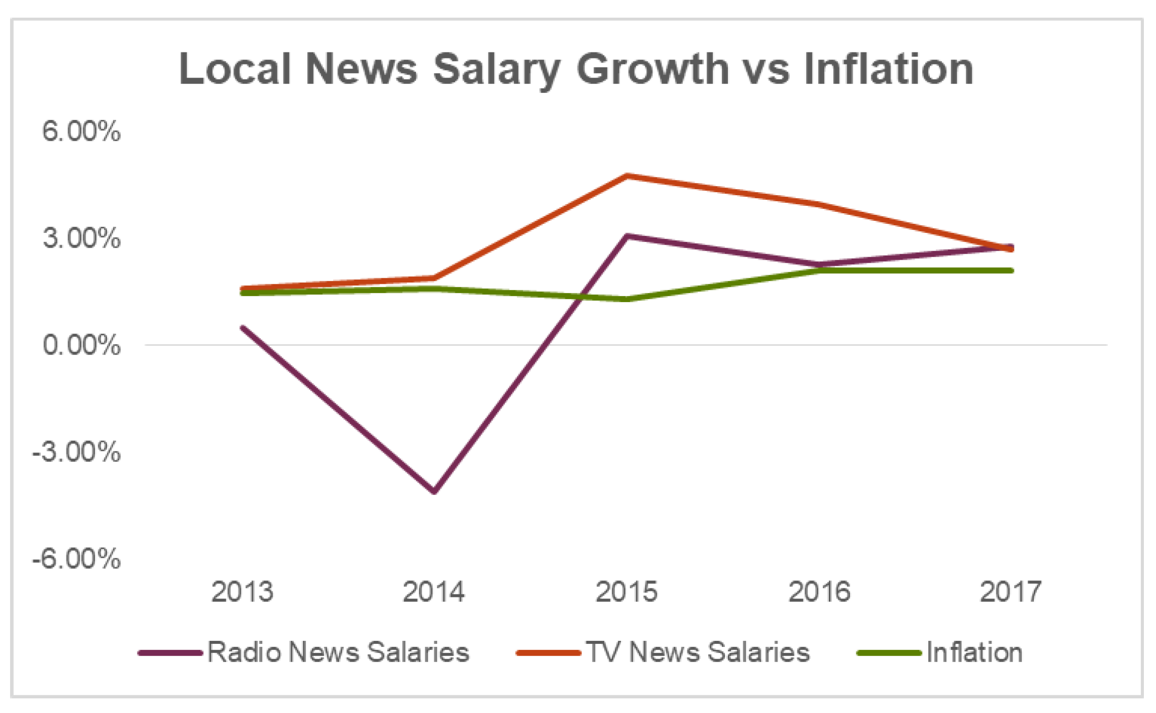 The growth in wages in the segment still beat inflation in 2017, and overall TV news salaries have risen at almost twice the rate of inflation during the past five years, the report found.