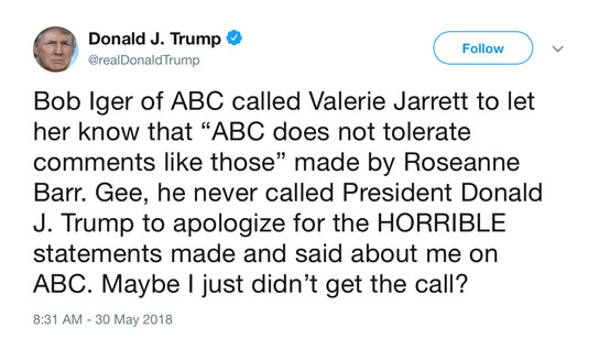 Trump’s tweet, which you can see below, reads: “Bob Iger of ABC called Valerie Jarrett to let her know that ‘ABC does not tolerate comments like those’ made by Roseanne Barr. Gee, he never called President Donald J. Trump to apologize for the HORRIBLE statements made and said about me on ABC. Maybe I just didn’t get the call?”