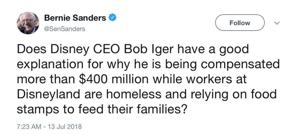 Bernie Sanders went after Disney CEO Bob Iger late last week, with the Vermont senator sending out a tweet Friday pointing out the pay disparity at Disney. You can see his tweet below.