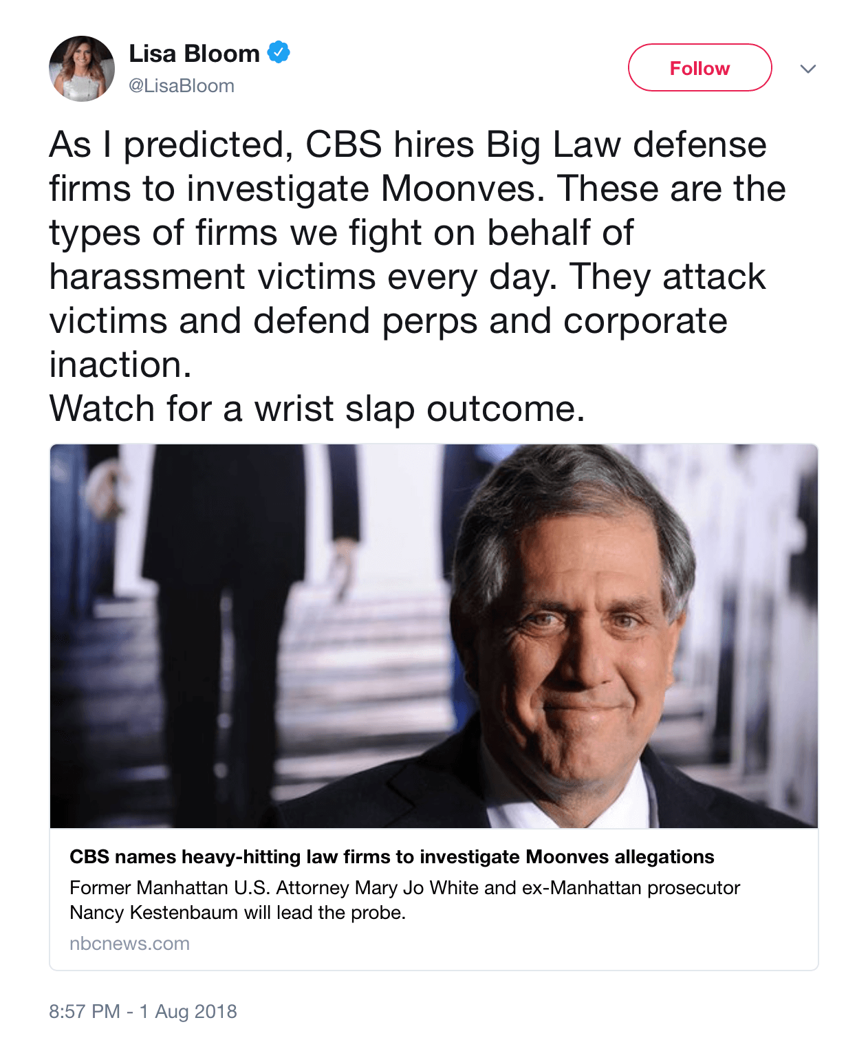 Bloom took to social media following the CBS announcement, predicting a “wrist slap” for Moonves and accusing CBS of hiring “Big Law defense firms” to investigate Moonves. You can see her tweet below.