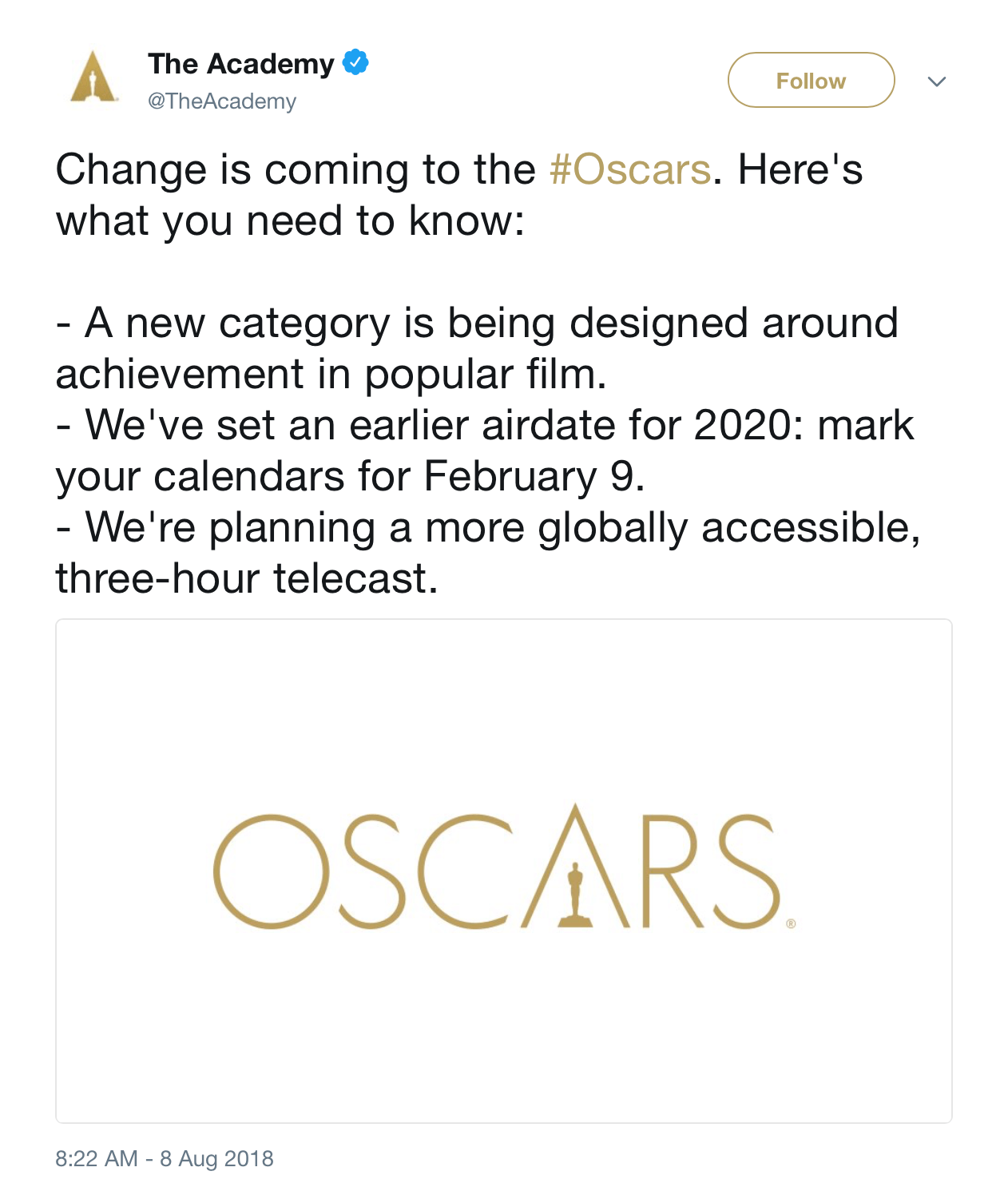 The academy was listening, apparently, sending out a tweet Wednesday morning announcing all the changes ABC wanted, which you can see below.