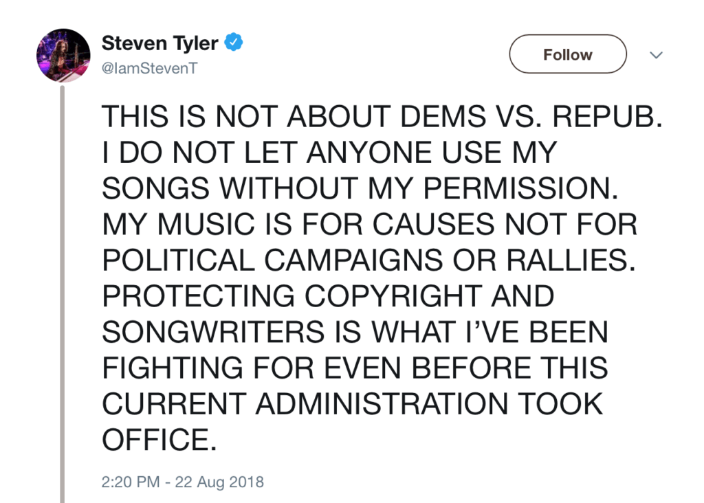Tyler later said in a post on Twitter: “This is not about Dems vs. Repub. I do not let anyone use my songs without my permission. My music is for causes not for political campaigns or rallies. Protecting copyright and songwriters is what I’ve been fighting for even before this current administration took office.”