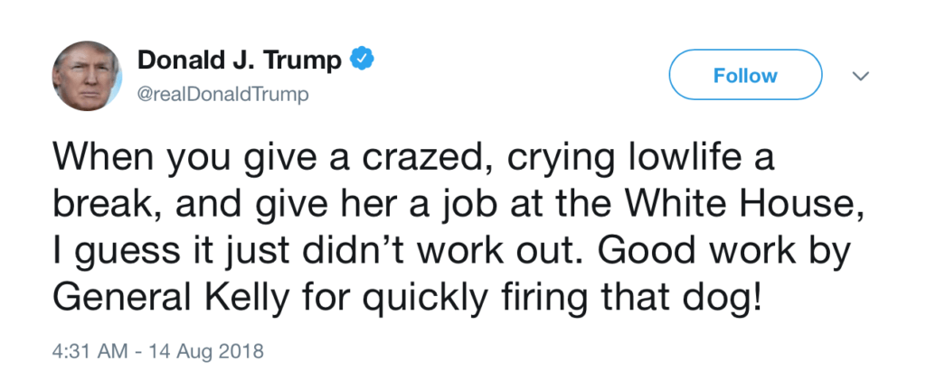 Donald Trump is taking no prisoners in his war with former White House staffer Omarosa Manigault Newman, referring to her in a tweet sent out this morning as a “dog” and a “crazed, crying lowlife.” You can see his tweet below.