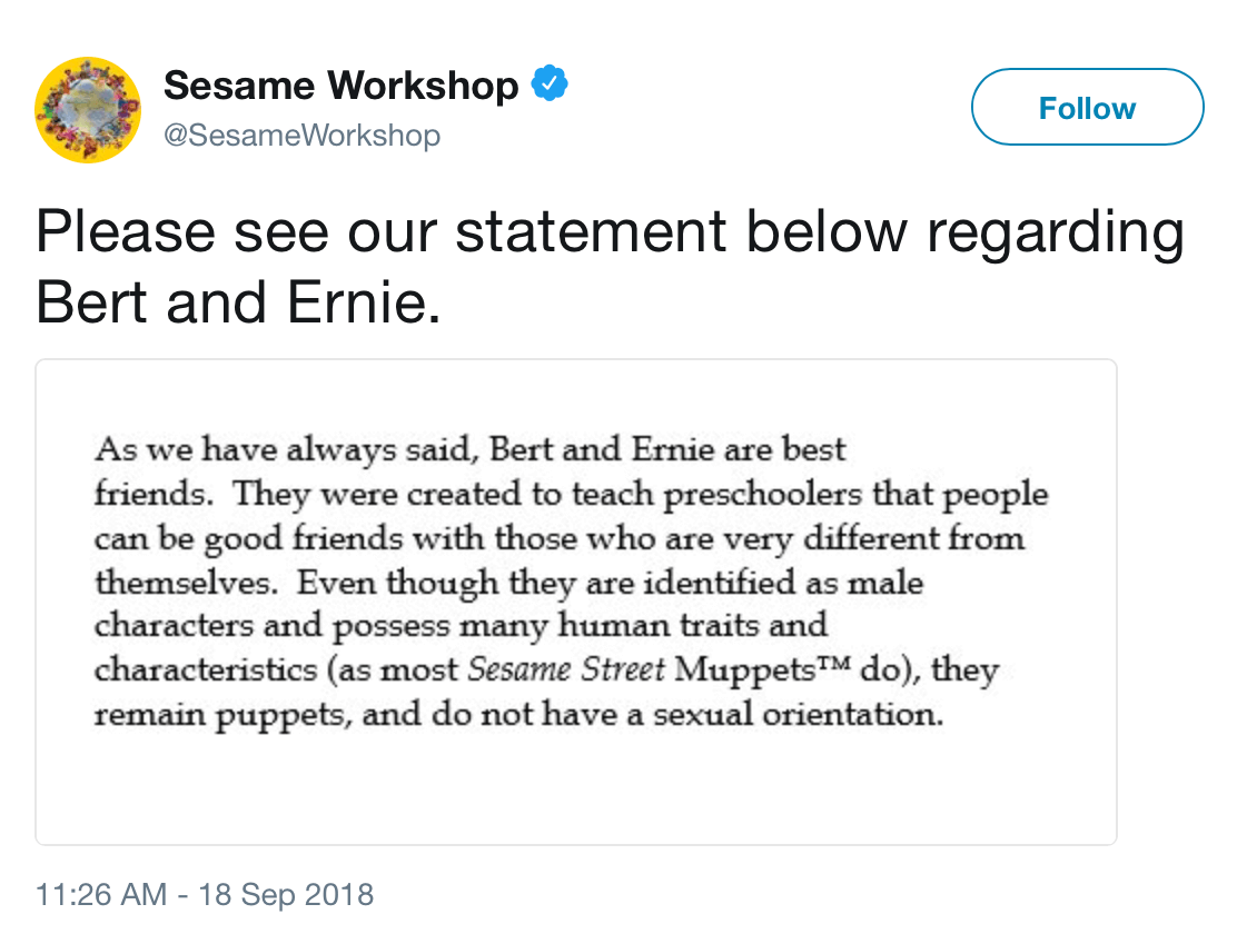 “As we have always said, Bert and Ernie are best friends,” the message says. “They were created to teach preschoolers that people can be good friends with those who are very different from themselves. Even though they are identified as male characters and possess many human traits and characteristics (as most ‘Sesame Street’ Muppets do), they remain puppets, and do not have a sexual orientation.”