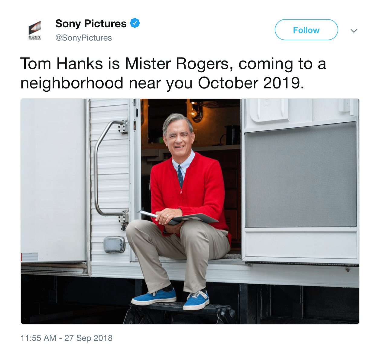 Sony Pictures just released the first photo of Tom Hanks as Mister Rogers, with Hanks playing the iconic TV children’s show host Fred Rogers in an upcoming film. The as-yet-untitled movie is due out in October 2019.