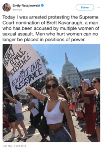 Ratajkowski put up a tweet about her own incident, which you can see below. She wrote: “Today I was arrested protesting the Supreme Court nomination of Brett Kavanaugh, a man who has been accused by multiple women of sexual assault. Men who hurt women can no longer be placed in positions of power.”