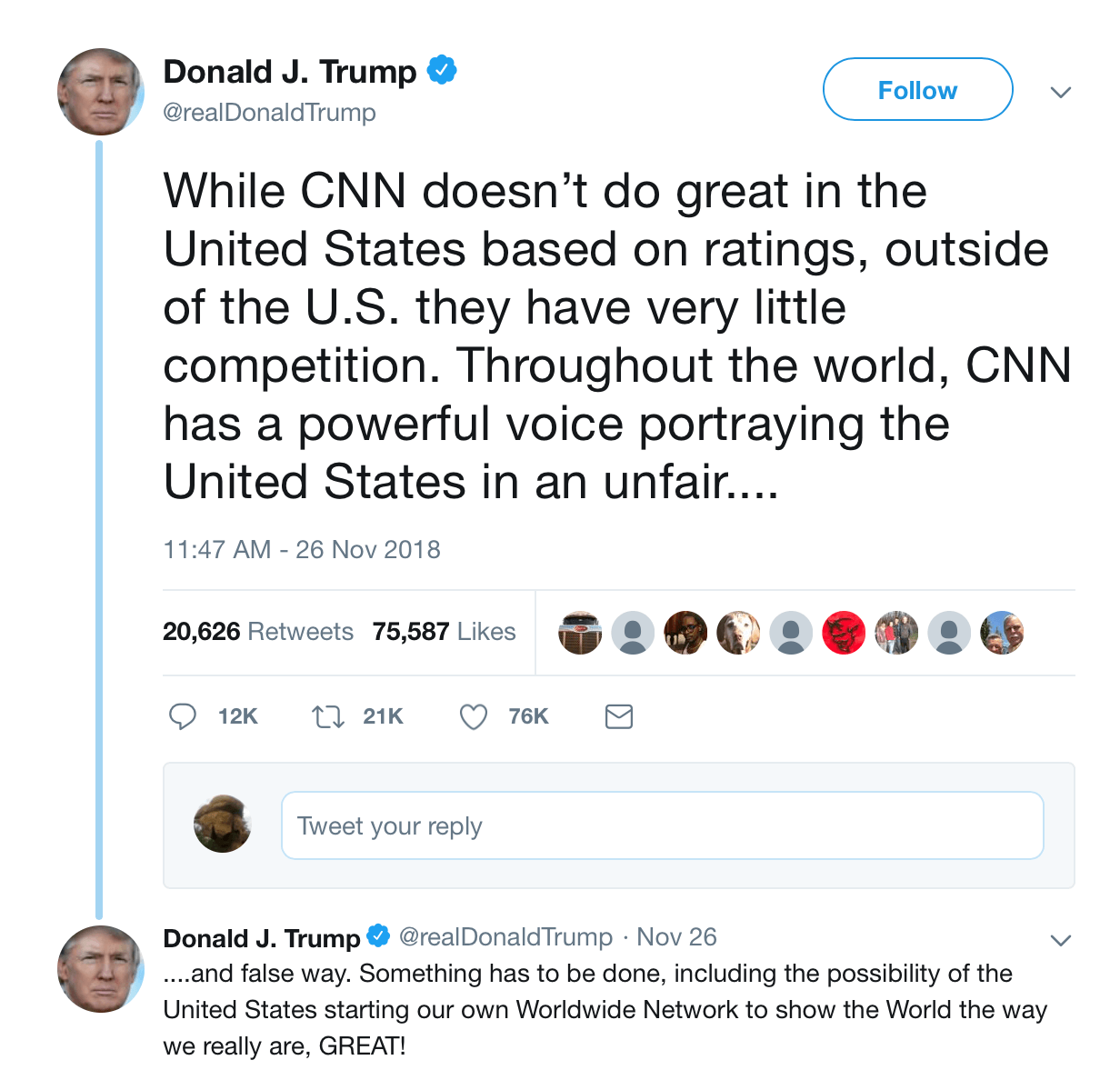 “Throughout the world, CNN has a powerful voice portraying the United States in an unfair and false way,” Trump wrote. “Something has to be done, including the possibility of the United States starting our own Worldwide Network to show the World the way we really are, GREAT!”