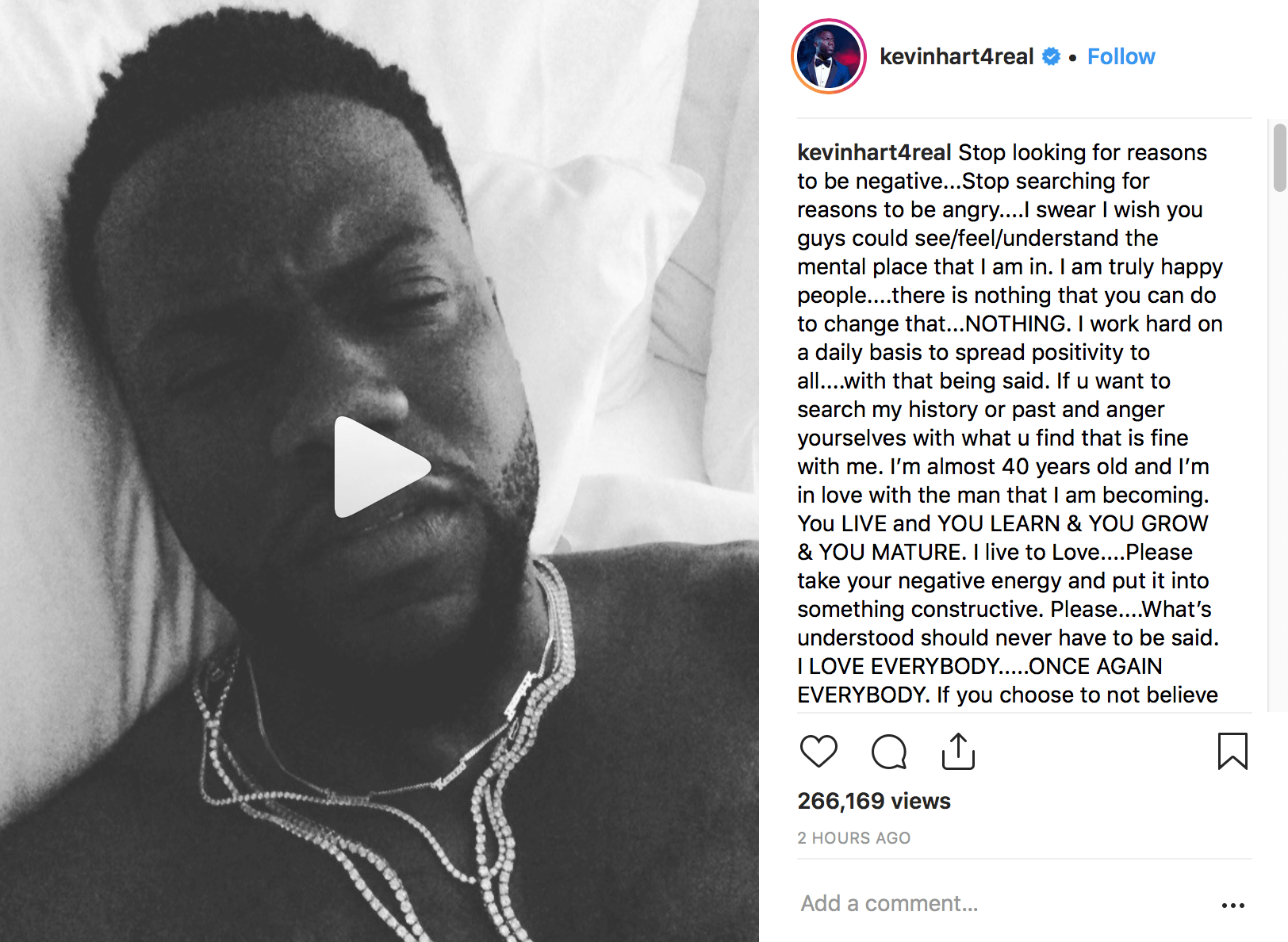 Hart took to Instagram to respond to the criticism with a video and a message admonishing followers to “stop looking for reasons to be negative.”
