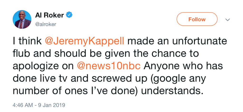 Al Roker voiced support for a TV meteorologist who was fired for an on-air flub that sparked controversy over whether his words amounted to racism or were merely a slip of the tongue.