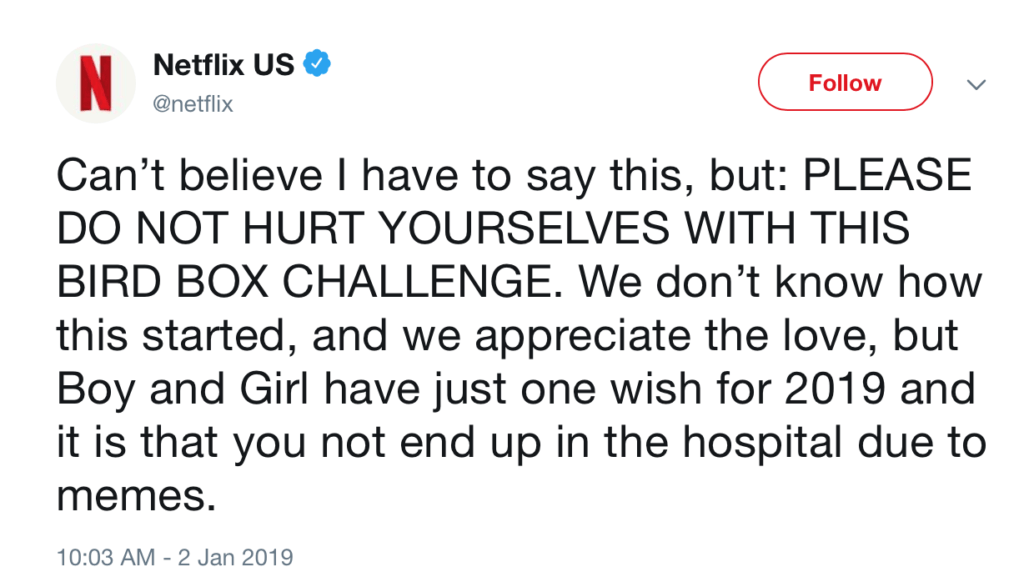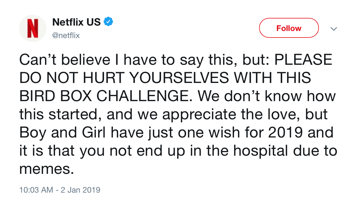 Netflix addressed the dangers of the “Bird Box” challenge in its own message posted on Twitter earlier this month, which you can see below …