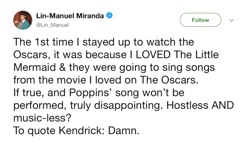 Miranda responded strongly on social media, saying in a tweet: “The 1st time I stayed up to watch the Oscars, it was because I LOVED The Little Mermaid & they were going to sing songs from the movie I loved on The Oscars. If true, and Poppins’ song won’t be performed, truly disappointing. Hostless AND music-less? To quote Kendrick: Damn.”