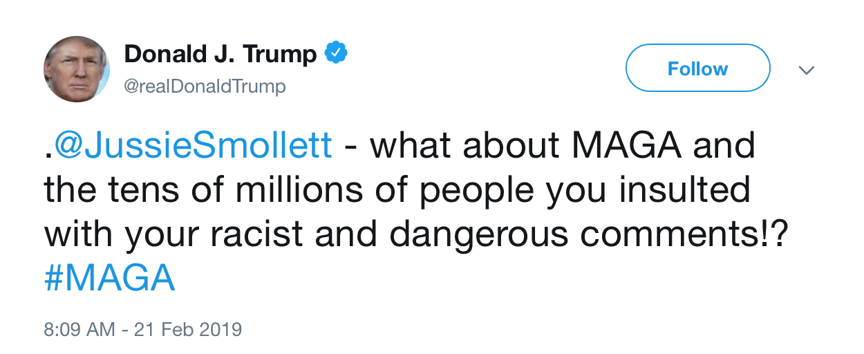 Donald Trump weighed in on the Smollett case this morning on Twitter, calling Smollett’s comments “racist and dangerous.” You can see Trump’s tweet below.