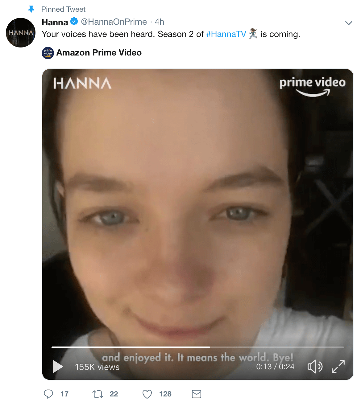Deadline quotes Albert Cheng, co-head of television for Amazon Studios, saying this week: “We knew we had something unique with ‘Hanna,’ and with the added momentum from its special post-Super Bowl preview, Amazon Prime Video customers worldwide agreed. Since it debuted only ten days ago, ‘Hanna’ has had a tremendous response, and we’re thrilled with not only how it has performed for us on the service, but with the action-packed world David Farr has created for the series and the stellar cast, led by Esme Creed-Miles, Mireille Enos and Joel Kinnaman. We’re excited to give fans a chance to see Hanna continue her journey on Amazon.”