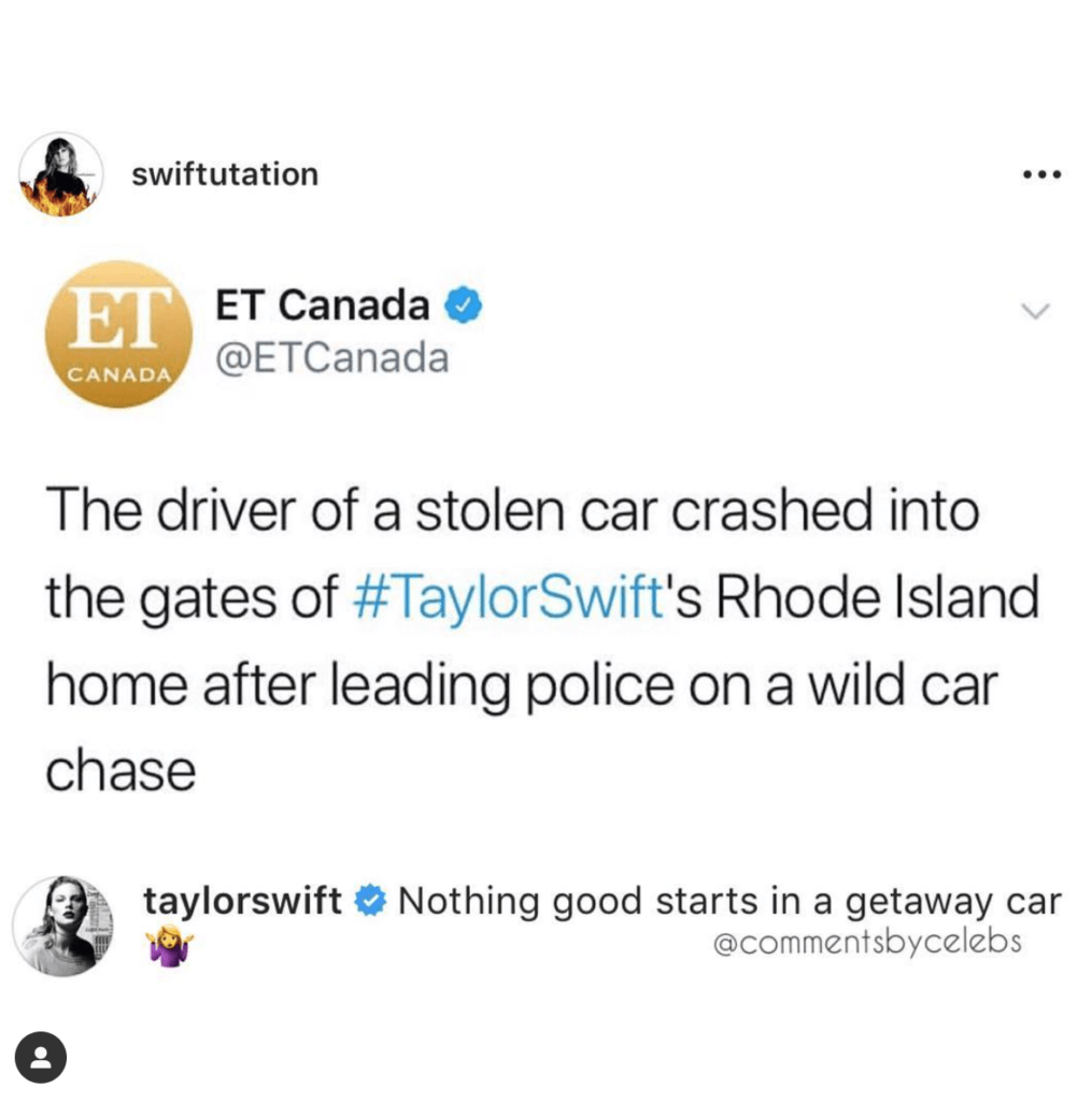 ET Canada posted a “just the facts” note about the incident on Instagram, to which Swift responded, “Nothing good starts in a getaway car.”