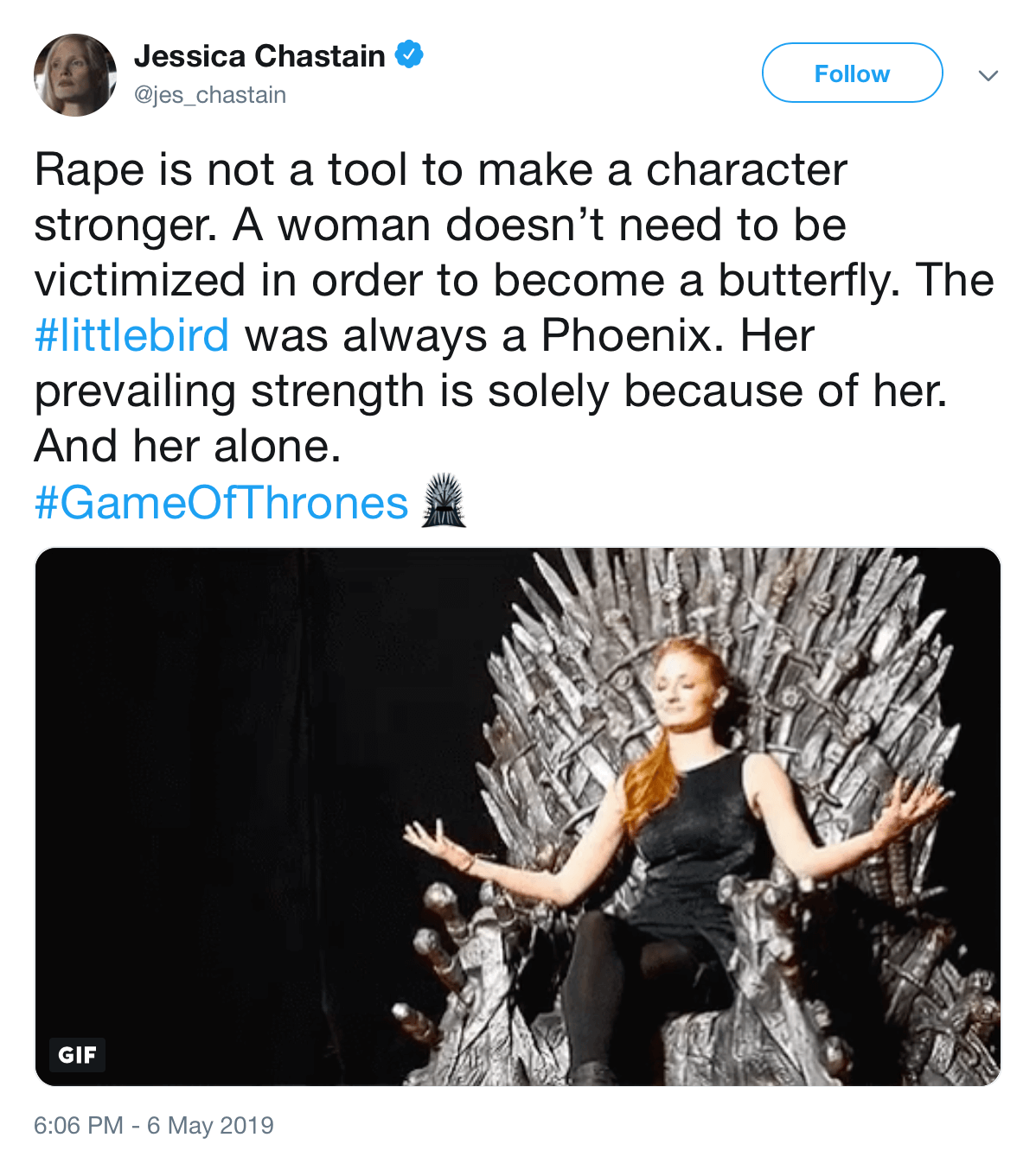 Chastain let her feelings be known in a tweet sent out following Sunday’s episode, writing: “Rape is not a tool to make a character stronger. A woman doesn’t need to be victimized in order to become a butterfly. The #littlebird was always a Phoenix. Her prevailing strength is solely because of her. And her alone.”